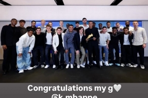 贝林厄姆也通过社媒晒出了皇马全队同手持金靴奖杯姆巴佩的合影,并配文:“祝贺我的兄弟@姆巴佩”。