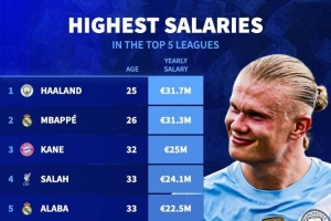 体育资讯11月3日讯 德国转会市场统计了五大联赛球员的年薪,并列出榜单,哈兰德3170万欧居首。