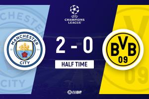 上半场补时2分钟。半场战罢,曼城2-0多特。