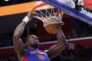 活塞内线杜伦上半场表现不错,尤其是第二节在球队落后时,他在内线表现活跃,不仅有空接暴扣,还有抢下前场篮板后的暴扣,帮助球队缩小分差。