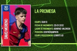 大卫-莫雷诺是巴萨青训营中最具潜力的球员之一。上赛季,他成为了巴萨所有11人制球队中最耀眼和最令人瞩目的球员。这名左脚中场将在明年1月25日年满14岁,2023-24赛季从莱万特加盟后,他已经在巴萨青训营度过了两个辉煌的赛季。