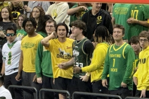今日俄勒冈大学以67-63战胜莱斯大学,取得开季两连胜,小吧来到现场观战,看到现场有很多林葳的球迷,一个外国人还穿着同曦球衣。