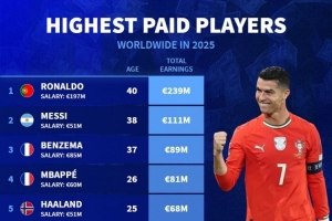 2025年球员收入排名:C罗2.39亿欧居首,梅西1.11亿欧次席