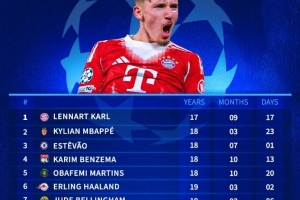 欧冠改制后连续3场破门最年轻榜单:17岁卡尔居首,姆巴佩次席